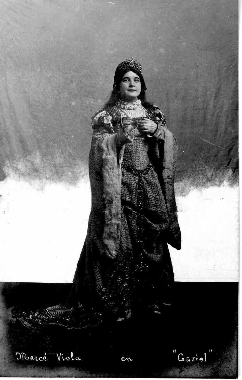 -Retrats d’estudi impresos en targetes postals de l’òpera Gaziel, composada per Enric Granados i amb lletra, escenografia i figuins d’Apel·les Mestres i que s’estrenà el 2 de novembre de 1906 per la Companyia de les Audicions Graner al Teatre Principal de Barcelona, i interpretada per  Mercè Viola, Marta Cazorla, Francisco Puiggener, Josep Santpere, Assumpció Paricio.